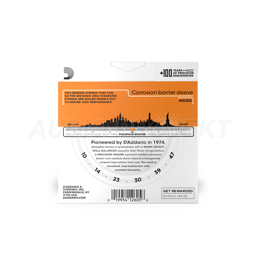 D’Addario Phosphor Bronze žice za akustičnu gitaru poznate su po toplom, balansiranom tonu i pouzdanoj kvaliteti izrade. Zahvaljujući preciznoj proizvodnji i dugogodišnjoj tradiciji, predstavljaju jedan od najpopularnijih izbora među gitaristima širom svijeta.
