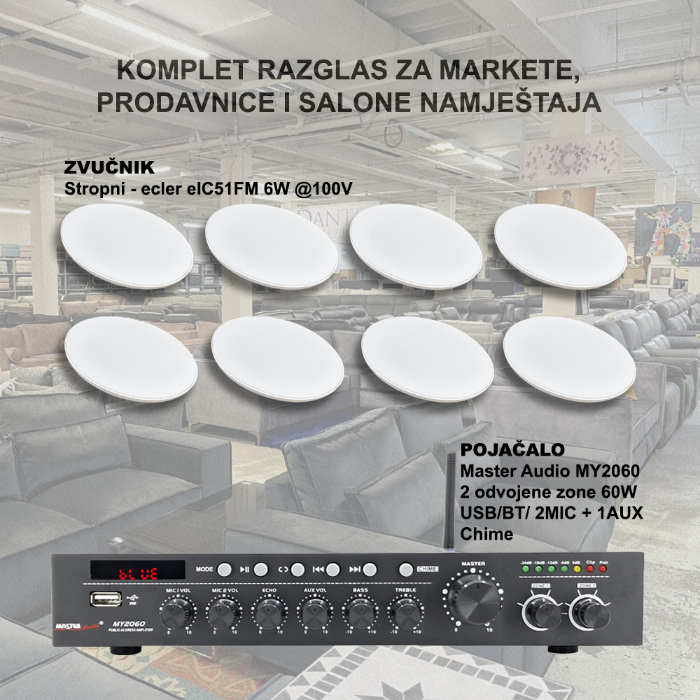 Komplet rješenje ozvučenja za markete, prodavnice, salone namještaja i slično. Set se sastoji od: