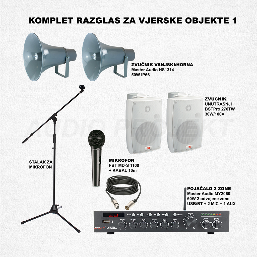 Kompletno rješenje razglasa za manji vjerski objekat. Set uključuje: