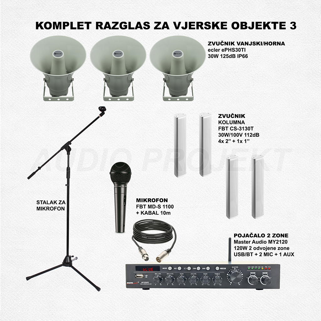 Kompletno rješenje razglasa za manji vjerski objekat. Set uključuje: