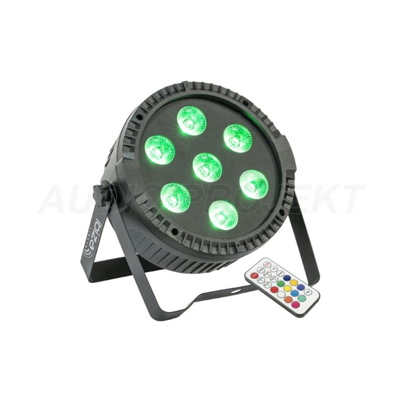 IBIZA THINPAR7X6-RGBW je extra-flat LED PAR reflektor sa 7 × 6 W 4-u-1 RGBW LED diodama, DMX kontrolom (4/8 kanala), Auto, Master-Slave, Sound aktivacijom i daljinskim upravljačem — idealan za DJ, event i scensku rasvjetu.
