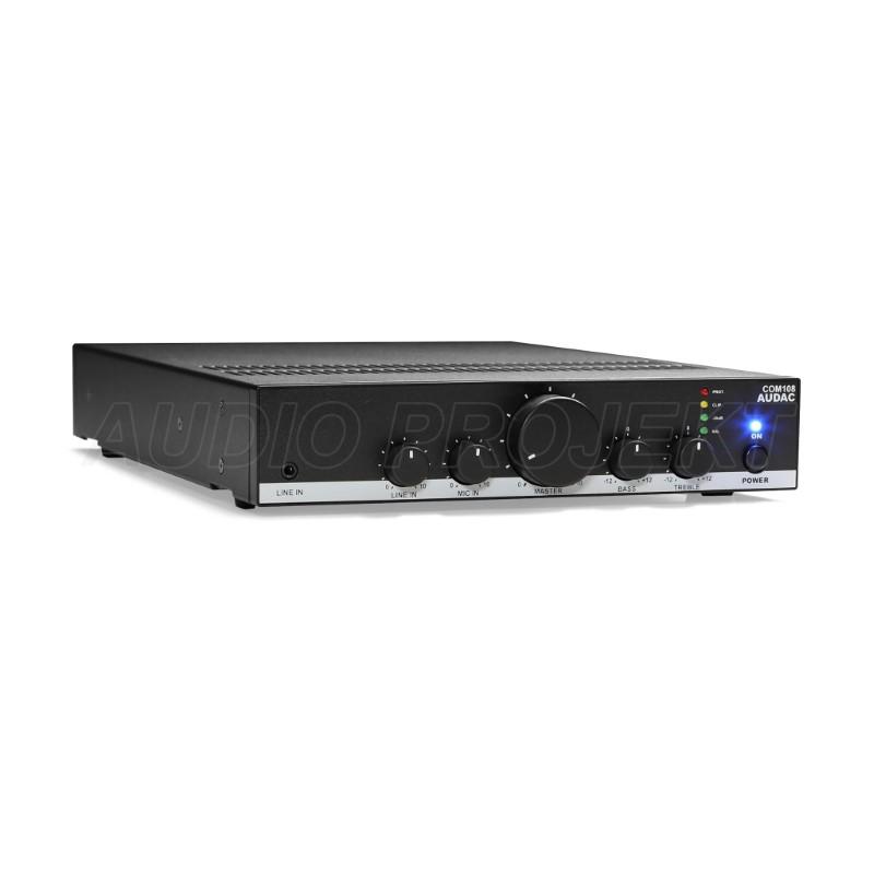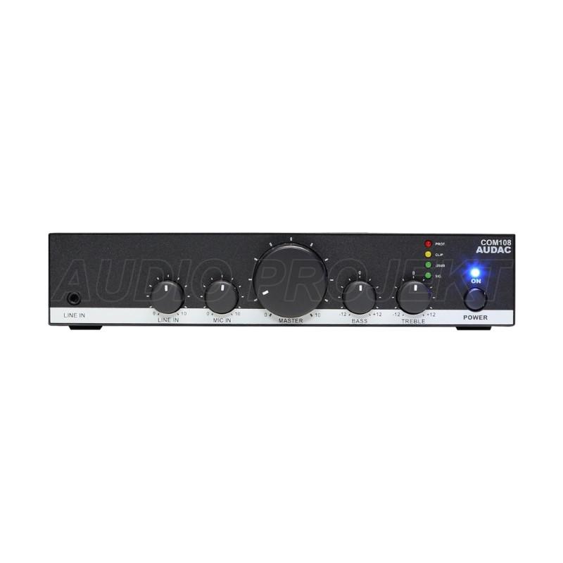 AUDAC COM108 je kompaktno public address (PA) mikser-pojačalo snage 80 W, dizajnirano za 70 V/100 V linijske i 4 Ω low impedance sisteme u manjim komercijalnim i servisnim okruženjima.