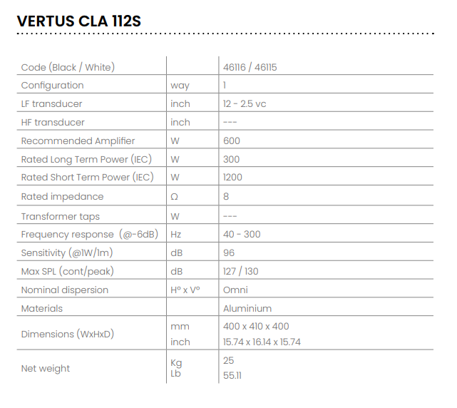 Elegantne i minimalističke linije karakteriziraju CLA 112S, novi visokofrekventni pasivni subwoofer od 12″ s 3″ zvučnom zavojnicom i IP55 certifikatom. Elegantni dizajn kućišta u potpunosti je izrađen od čvrstog aluminija zrakoplovne kvalitete koji štiti niskofrekventni pogon. Dolazi s Amphenol IP67 konektorom za IN i Throu te impedancijom od 8 Ohma. Zahtjeva vanjsku skretnicu i preporučeno pojačalo od 600 W RMS.