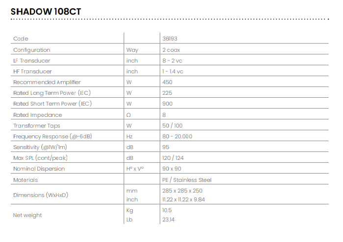 Pruža izvrsnu reprodukciju glazbe i govora u kompaktnom kućištu, osiguravajući jasnu razumljivost, s vrlo niskim izobličenjem čak i na velikim udaljenostima. Njegov široki raspon, glatki frekvencijski odziv i visoka učinkovitost osiguravaju visokokvalitetnu reprodukciju glazbe i čine ovaj sustav prikladnim za razne primjene, kao što su sportska igrališta ili arene, zabavni parkovi, bazeni, kruzeri, kongresni centri, plesne dvorane i općenito za vanjske sustave pozadinske glazbe i paging. Višenamjenski 8” koaksijalni zvučnik 450 W/8 ohma – 124 dB SPL