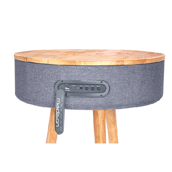 Drveni stolić za kavu s tkaninom u nostalgičnom obliku, koji sadrži pravi audio sustav. Slušajte svoju omiljenu glazbu i / ili napunite mobilni telefon dok se opuštate uz knjigu i piće.
